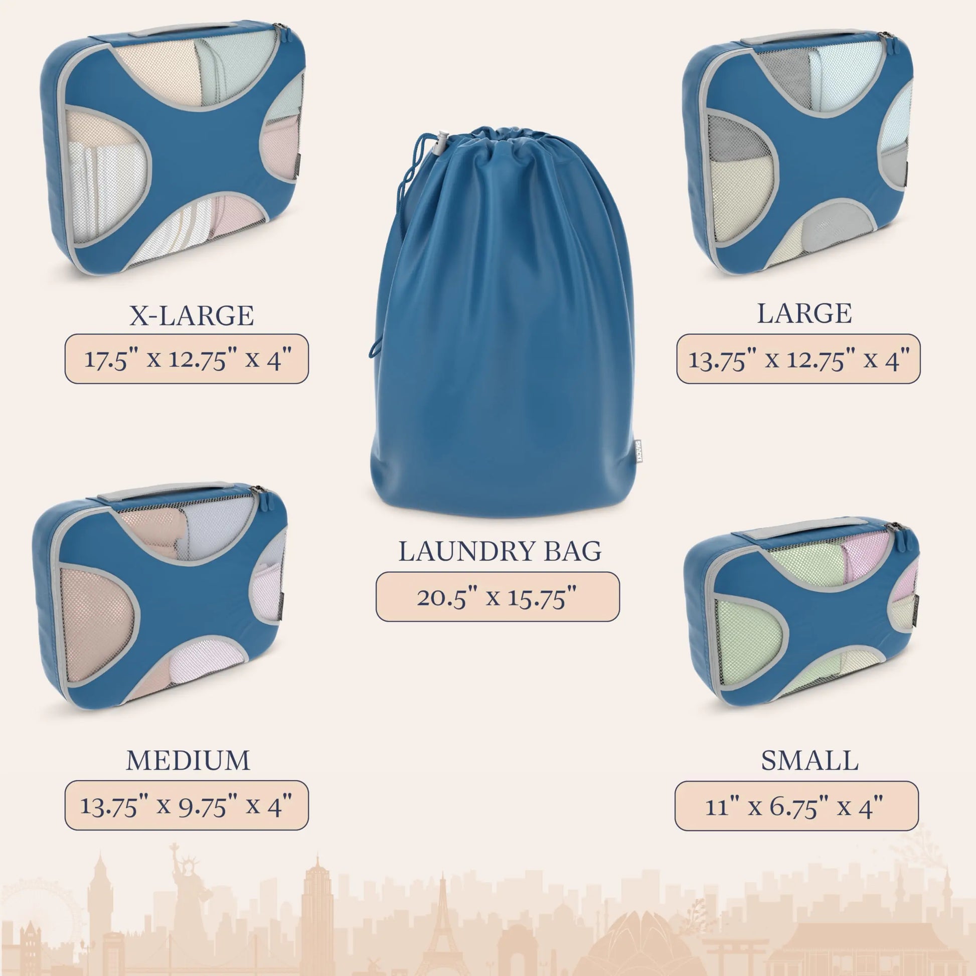 Pack more clothes in a small space for your next trip. One of the hardest things to do when packing for a trip is to fit everything you want to take with you in your luggage. Our packing cube system fixes this problem by packing all your clothes neatly into our space saving bags. It allows you to easily store and organize your clothes, making packing and unpacking even easier. Your clothes will remain wrinkle-free and will not be crushed during your travels. We have included a laundry bag with your cube set so you can separate your dirty clothes from your fresh clothes on your trip home. Shacke Pak is made from a high quality, durable, water resistant nylon material to withstand the wear and tear of travel. It is reinforced with an X-design woven seam specially designed to prevent the fabric from folding in half, allowing for a safer packing experience. Our bags are 4 inches deep giving you enough space to pack more clothes. Finally, we used YKK zippers on all of our cubes. YKK zippers are the world's largest high quality manufacturer of zippers and are known for their smooth, sturdy zippers. Shacke Pak Overview: - 4 packing cubes: extra large (17.5" x 12.75" x 4"), large (13.75" x 12.75" x 4"), medium (13.5" x 9.75" x 4"), small (11" x 6.75" x 4"). cm) - Laundry bag for storing dirty clothes at the end of your travels.