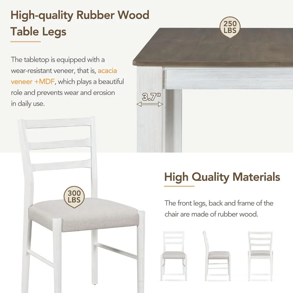 - High-Quality Materials: Crafted with high-quality materials, this dining set ensures long-lasting durability and stability. The table legs and apron are made of 3.7" thick rubber wood, while the table top is equipped with a wear-resistant veneer made of acacia veneer and MDF. The chair's front legs, back, and frame are also constructed from rubber wood. The solid wood legs provide safety and stability during use, with a weight capacity of 250 lbs for the table and 300 lbs for the chairs.