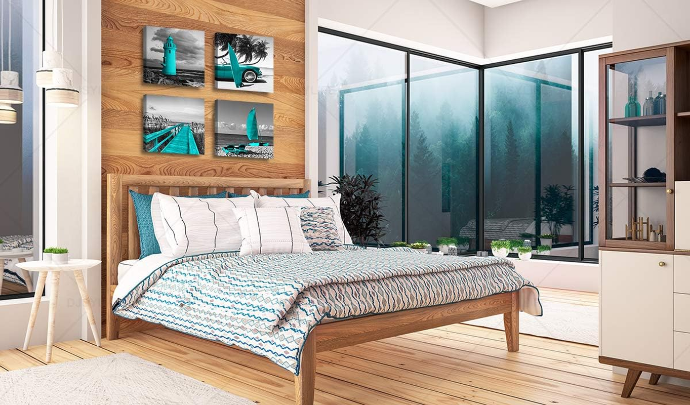 Beach Wall Art Teal Wall Decor Bathroom Decor Sets Accessories Black and White Ocean Lighthouse Painting Palm Tree Surfboard Car Bridge Picture Prints Seascape Office Bedroom Poster 12X12 Inches X4