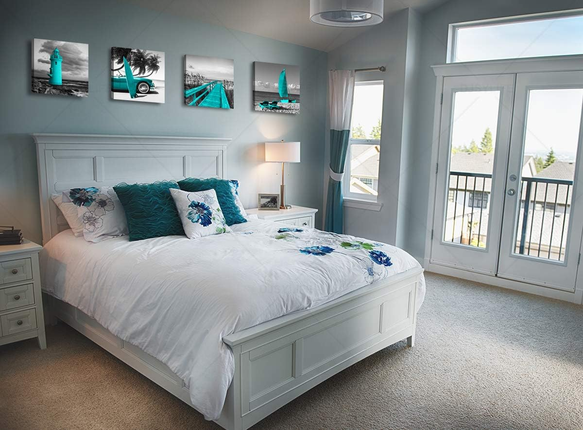 - Teal summer decorations size:12x12inchx4 (30x30cmx4).office wall decor,coastal wall decor,nautical bathroom decor,bedroom accessories for teen girls/ women, beautiful poster canvas artwork has a strong sense texture and artistic sense, demonstrating its noble and elegant temperament and taste.