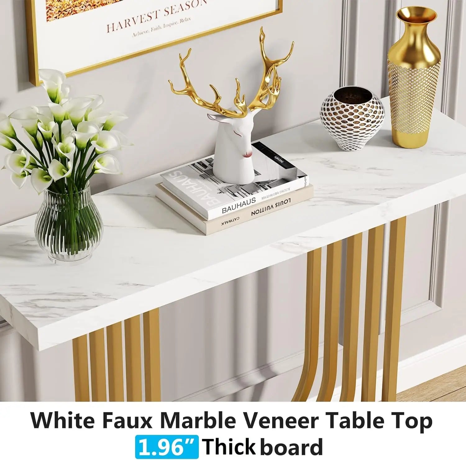 Console Table with Gold Base, 39.4 In Faux Marble Entryway Foyer Table, Sofa Accent Table for Living Room, Hallway, White & Gold