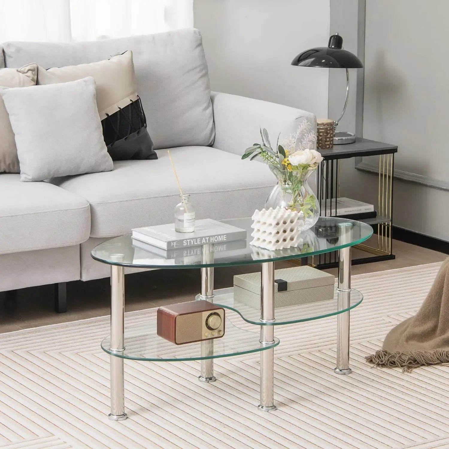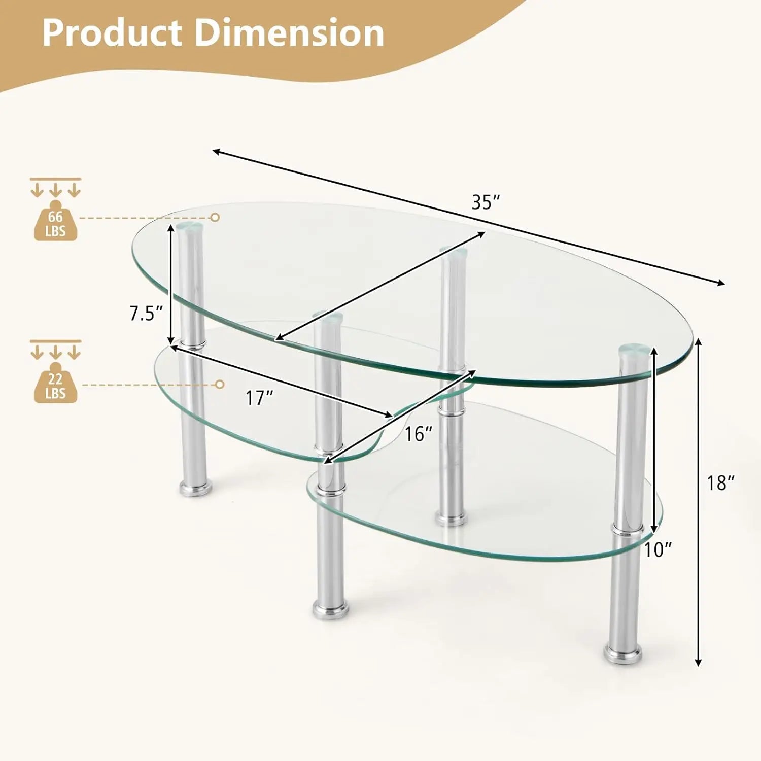 Glass Coffee Table, Furniture Decor 2-Tier Oval Glass Tea Table End Table for Home Office with 2 Tier Tempered Glass Boards