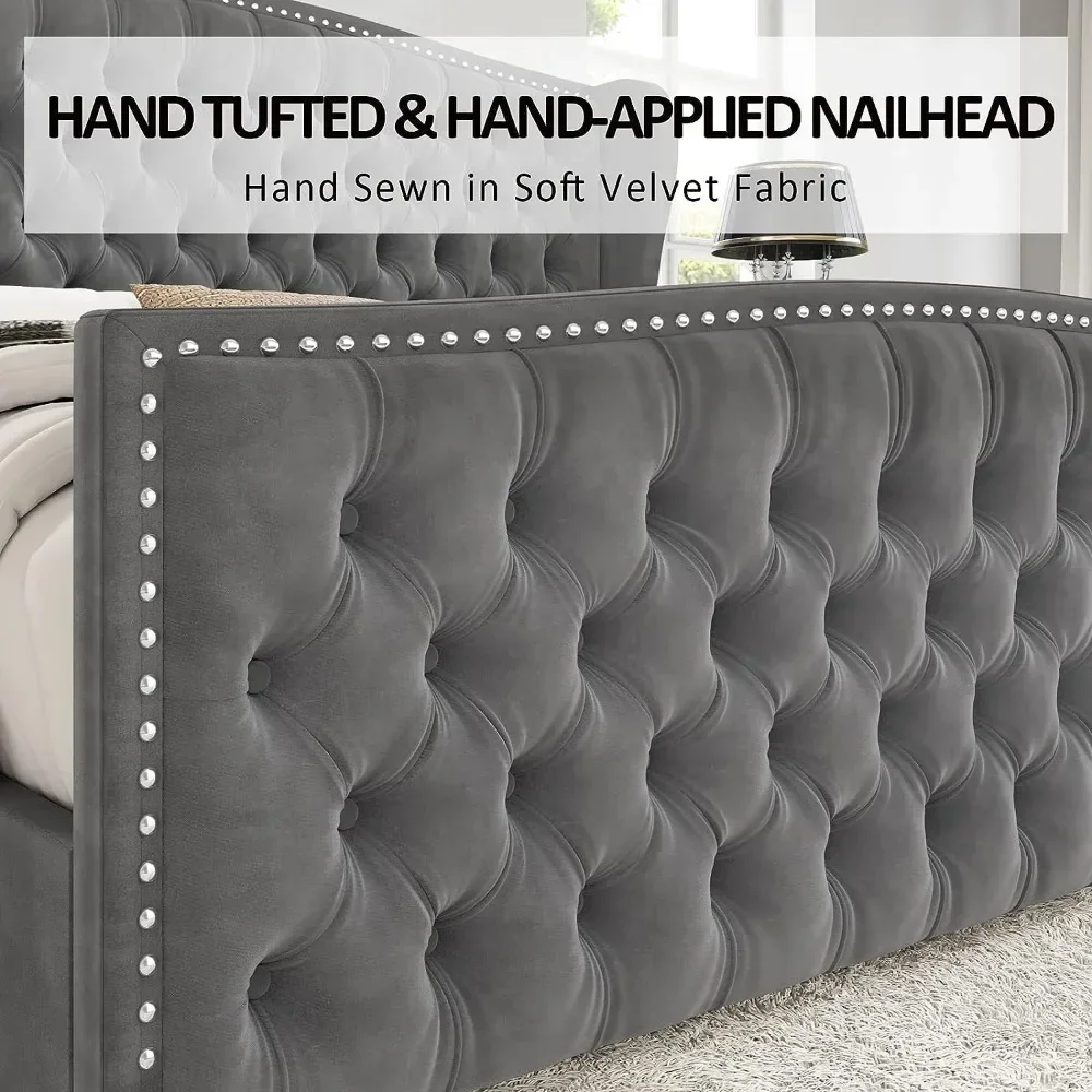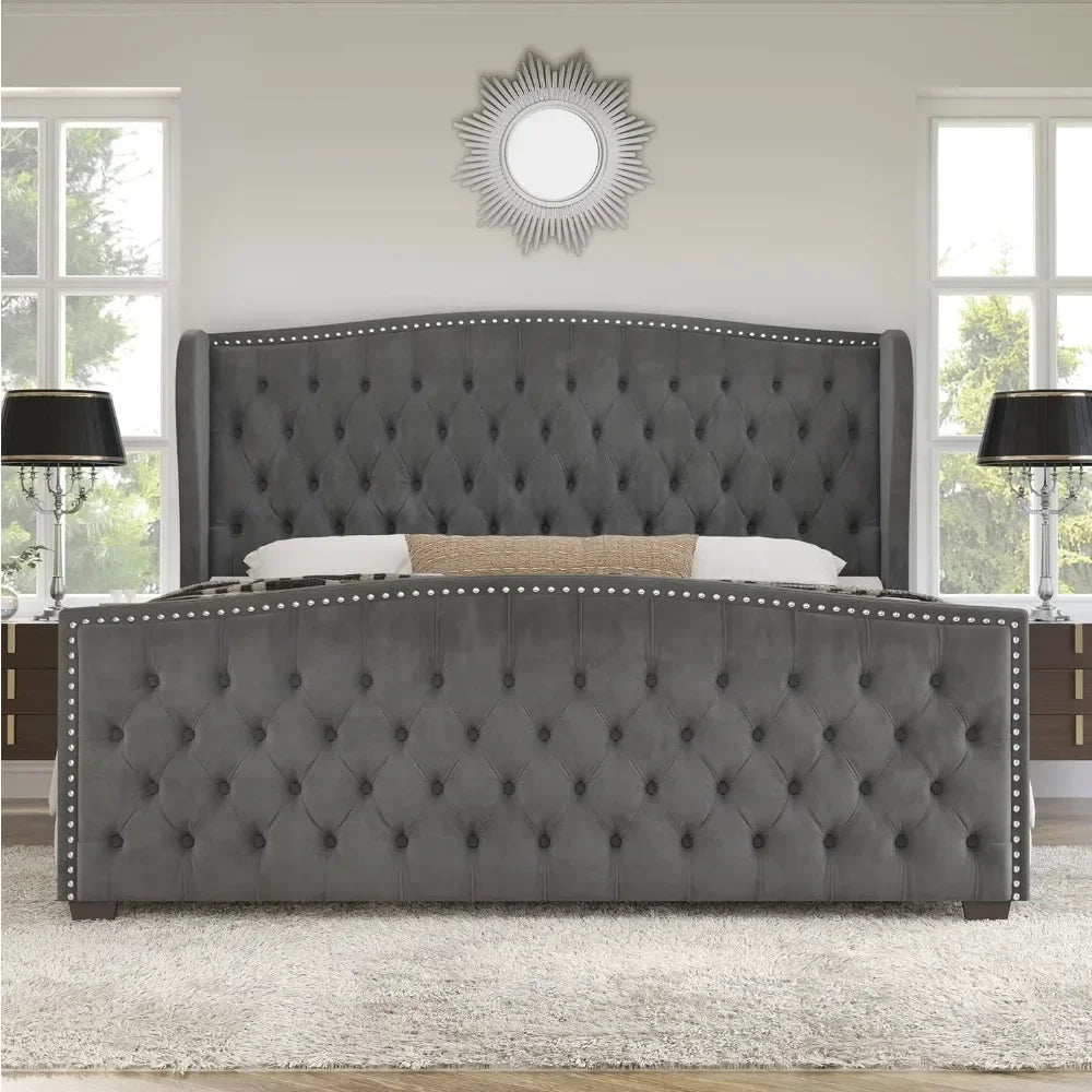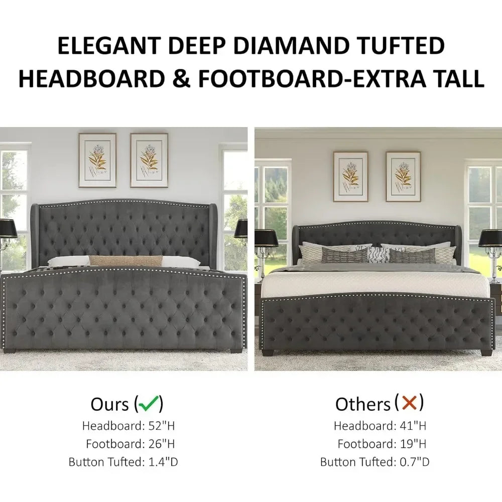 King Size Bed Frame, Velvet Upholstered Beds with Deep Button Tufted & Nailhead Trim Wingback Headboard, King Bed Frame