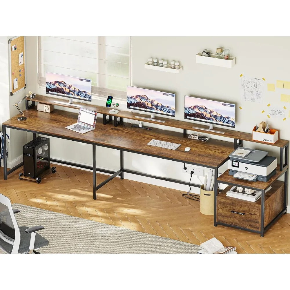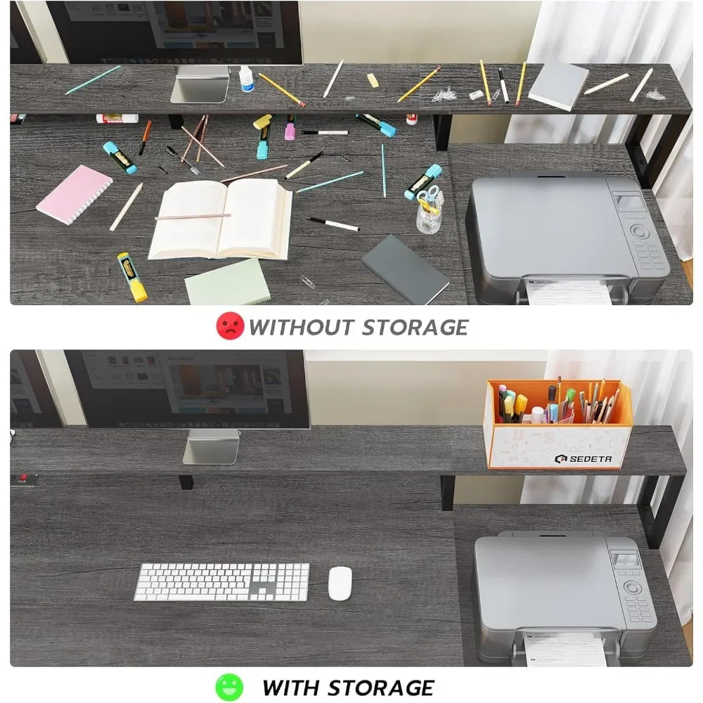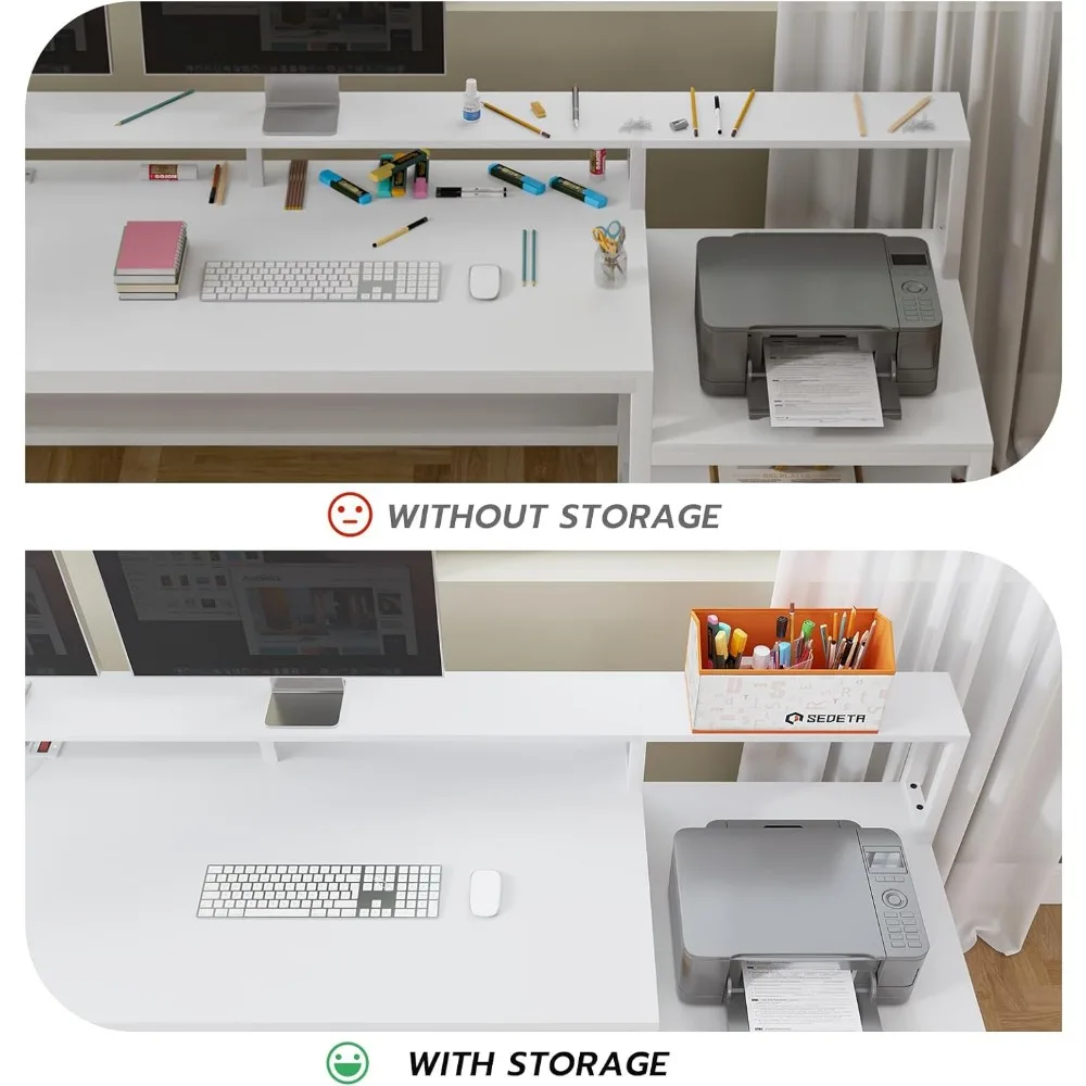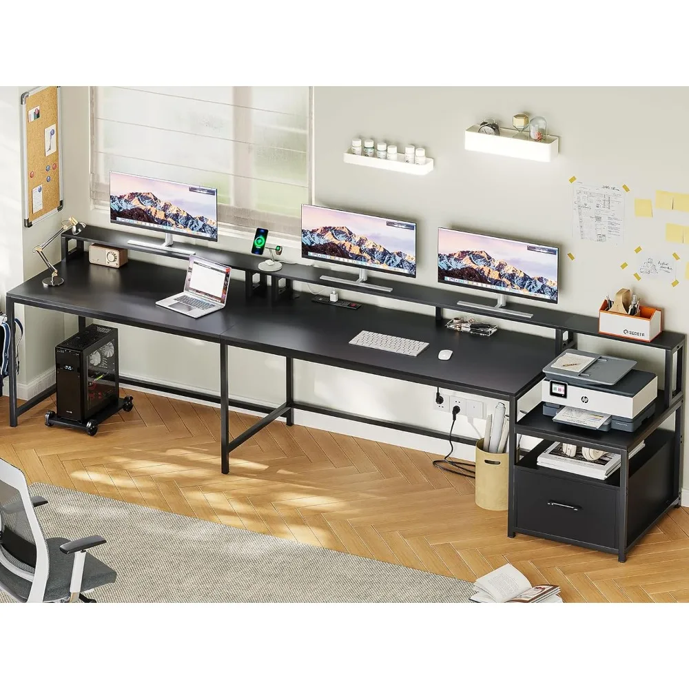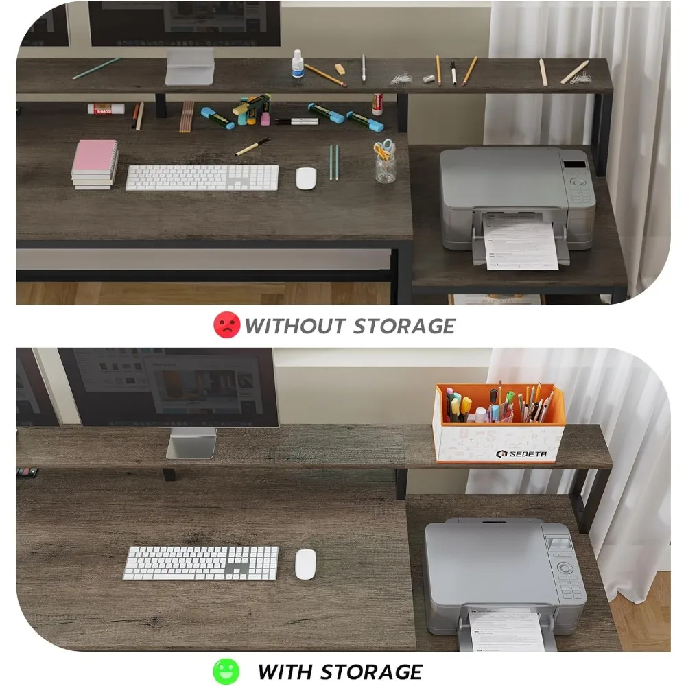 - 【Convertible Desk】67 inch corner desk or 98.4 inch two person desk: The L shaped computer desk could hold three desktop computers and one notebook computer. The desktop size is 47"L*18.5"W and 48"L*18.5"W. Or 96.4 inch two person desk can hold two-person studying or writing no interference. The simple design and multi-function storage to meet all needs. An ideal desk for small rooms or limited spaces to create excellent home office space.