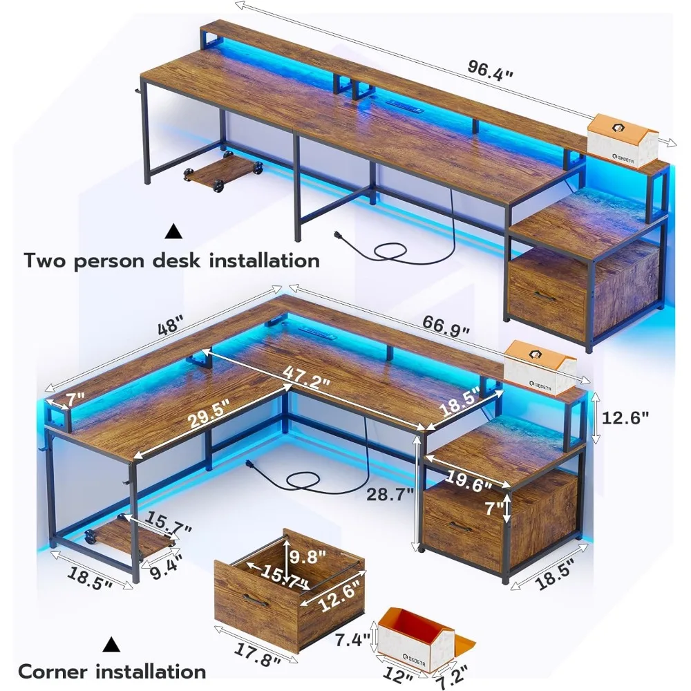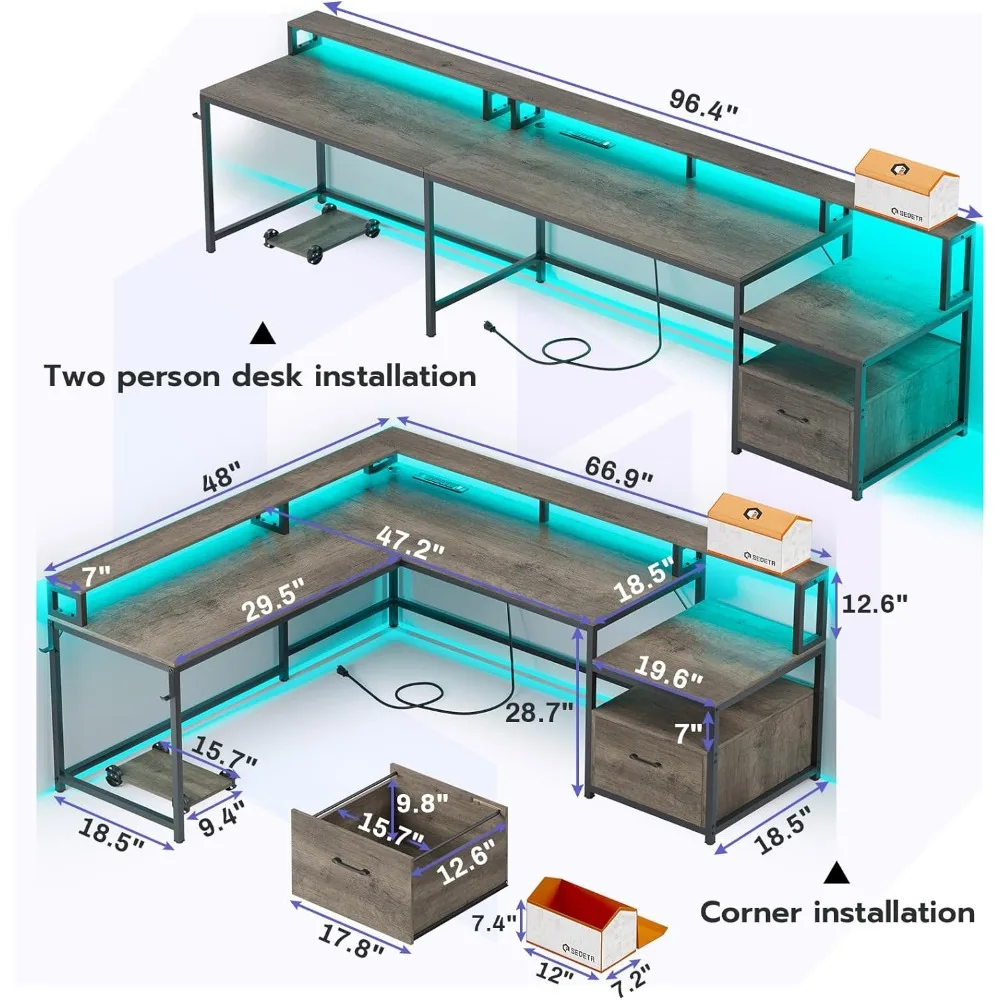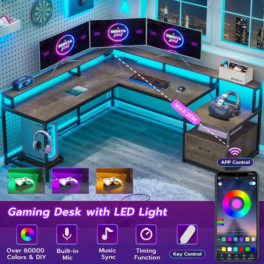 L Shaped Office Desk, 66" Home Office Desk with File Drawer & Power Outlet, Gaming Desk with Led Lights, Corner Computer Desk