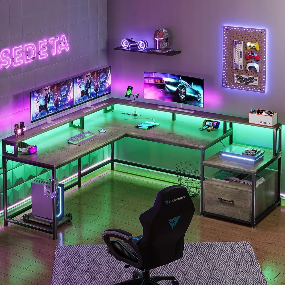 The decent layout L shaped computer desk has a large desktop, suitable for legal, letter, A4 size file drawers, charging port, led strip, desk organizer, printer stand, monitor shelf and CPU stand. Large work area can hold three desktop computers and one notebook, which can help you organize your workspace more efficient. If you need multiple computers to operate at the same time while working, or if you want to work with your family members, this oversized computer table is your best choice.