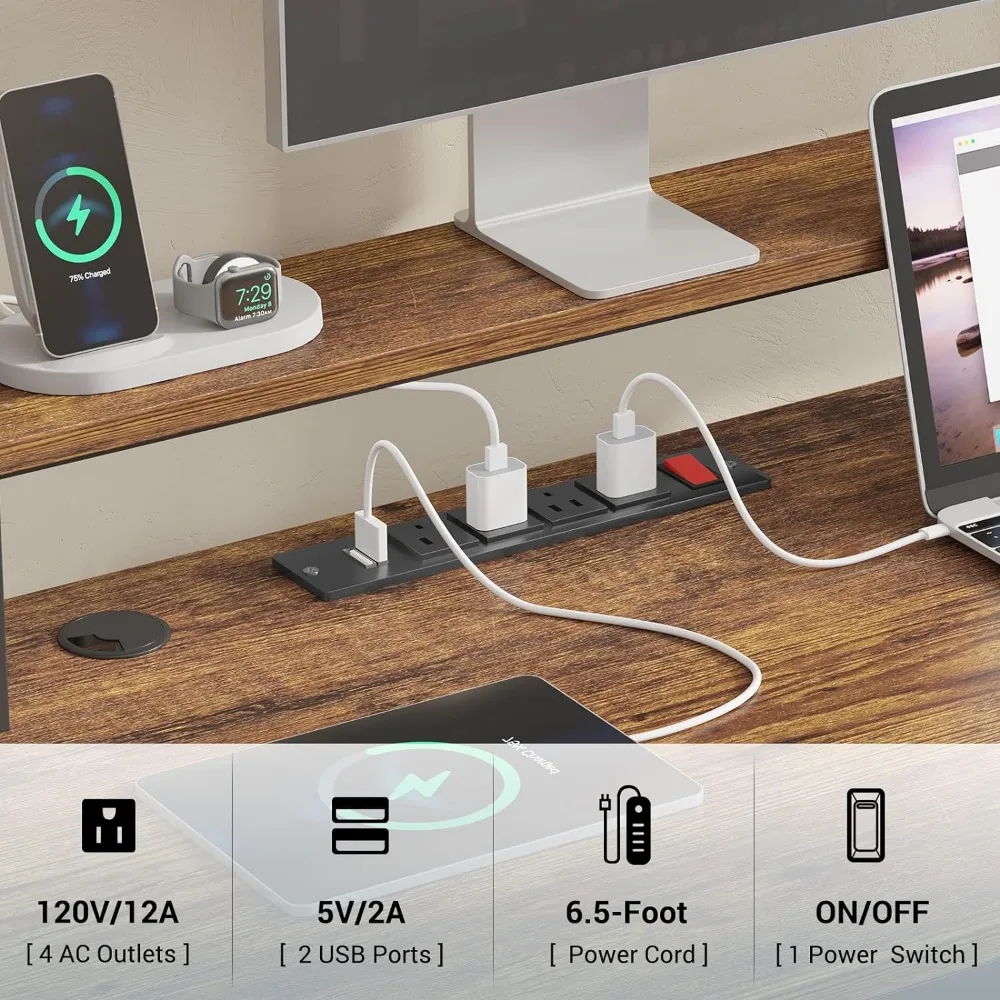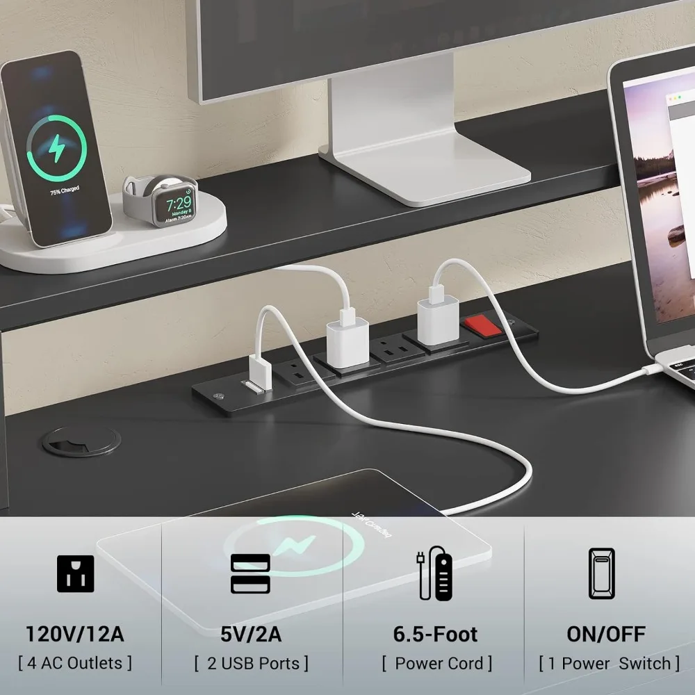 - 【For Health】The monitor shelf conforms to the ergonomic structure, which effectively reduces the pressure on the back and neck, so that you don't need to worry too much about health problems when you were working. At the same time, a headset hook is provided on the side, so that the headset is at your hand, and you don't need to worry about finding headphones for playing games.Our charging station includes 4-Outlet & 2 USB Ports to provide power for up to 6 devices simultaneously.