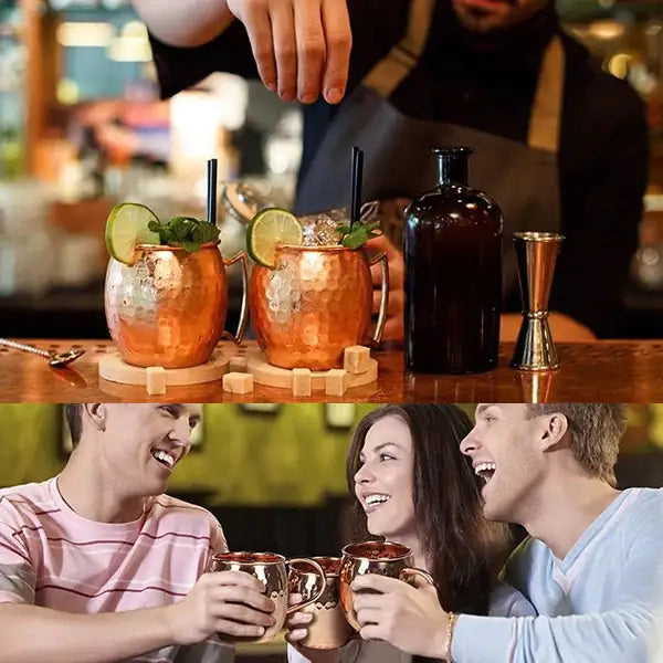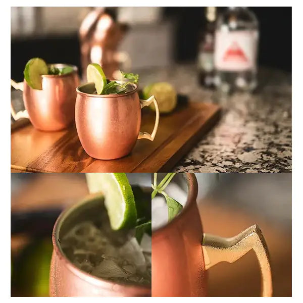 These copper polished mugs come in two options, solid or hammered on the outside...They are a novelty and feel like a luxury when you enjoy your cocktails or mocktails with your friends! Even simple fruity water and tangy lemonade served chilled in these mugs feel like a celebration! Garnish with mint leaves and enjoy the kick of the flavor out of these timeless Moscow Mules, you will simply love it!