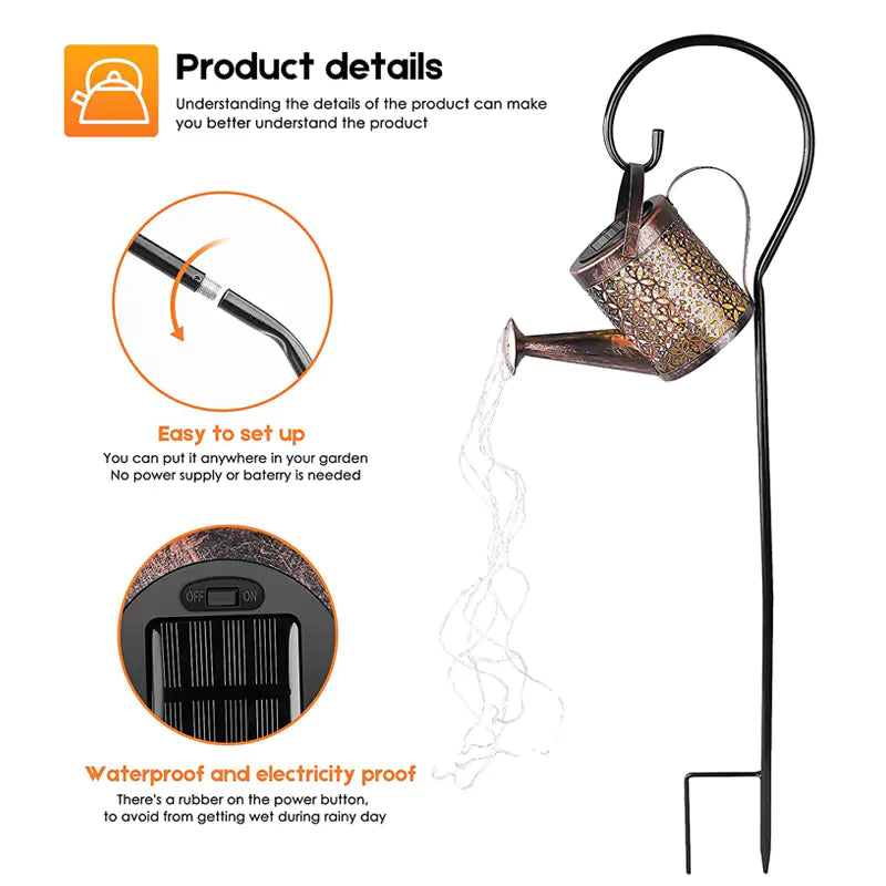 Enhance the beauty of your garden with our Solar-Powered Watering Can, and let your outdoor oasis shine with radiant splendor. Order now and transform your garden into a captivating sanctuary of light and style!